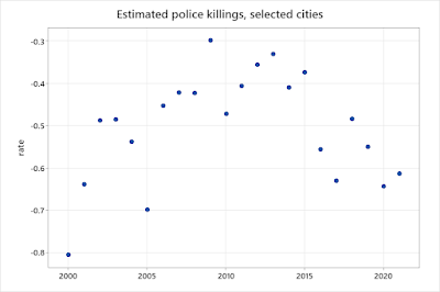 The Lancet article that started me on these posts says: "more recent reform efforts to prevent police violence in the USA, including body cameras, implicit bias training, de-escalation, and diversifying police forces, have all failed to further meaningfully reduce police violence rates. As our analysis shows, fatal police violence rates and the large racial disparities in fatal police violence have remained largely unchanged or have increased since 1990." There analysis actually showed that racial disparities had declined, but even apart from that, stability or increase in the overall rates doesn't mean that reforms have been ineffective: it's possible that there are some factors that have worked to increase rates and others that have reduced them. The fact that the rates have moved in different directions in different places suggests that is the case.
