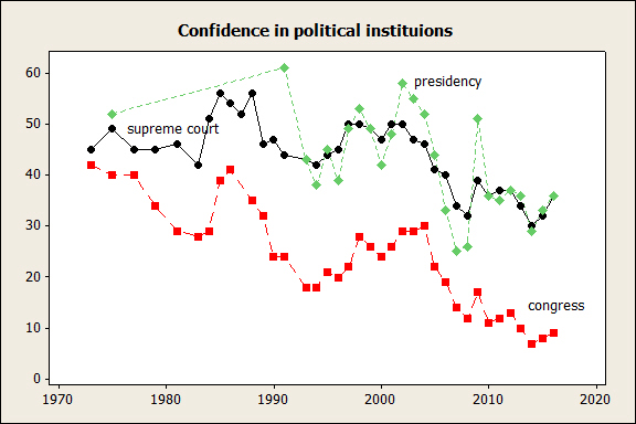 Since the 1970s, the Gallup Poll has asked "I am going to read you a list of institutions in American society. Please tell me how much confidence you, yourself, have in each one--a great deal, quite a lot, some, or very little?" The list has changed, but there is at least twenty years of data for the following: the church or organized religion, the military, the US Supreme Court, banks, the public schools, newspapers, Congress, television news, organized labor, the presidency, the police, the medical system, the criminal justice system, and big business. Tables giving the data are available at the Gallup website. I converted them to figures in order to get a clearer sense of changes--the y-axis gives the percent saying they have "a great deal" or "quite a lot" of confidence.